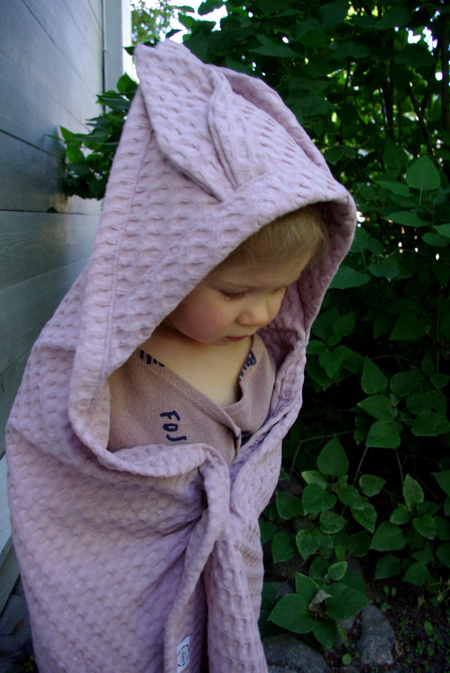 Lapsen pyyhkeessä on nurkissa taskumaiset läpät, joista lapsen on itse mahdollista pitää kiinni ja kääriytyä pyyhkeen sisään kuivattelemaan ja lämmittelemään. Pyyhkeessä on ripustamista helpottamaan lenkki hupun yläosassa. Materiaalin rakenne muuttuu pesussa muhkeammaksi.